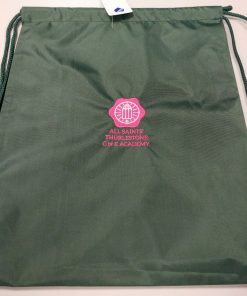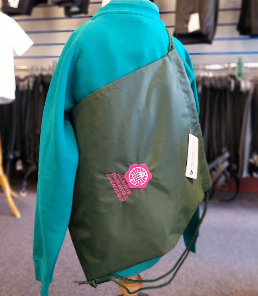 Drawstring PE bag. Ideal for swimwear and muddy kits. Embroidered for All Saints’ Thurlestone.