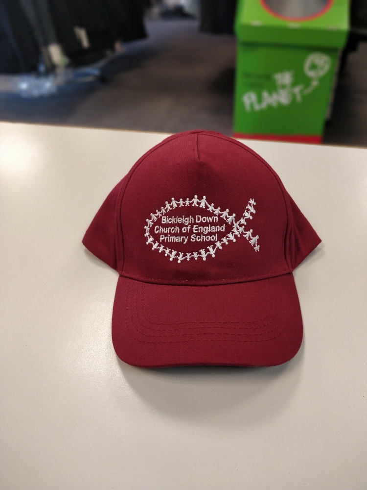 55cm cotton baseball cap. Embroidered for Bickleigh Down Primary School. 100% cotton. Flexible d-shape vent on rear for pony-tail.