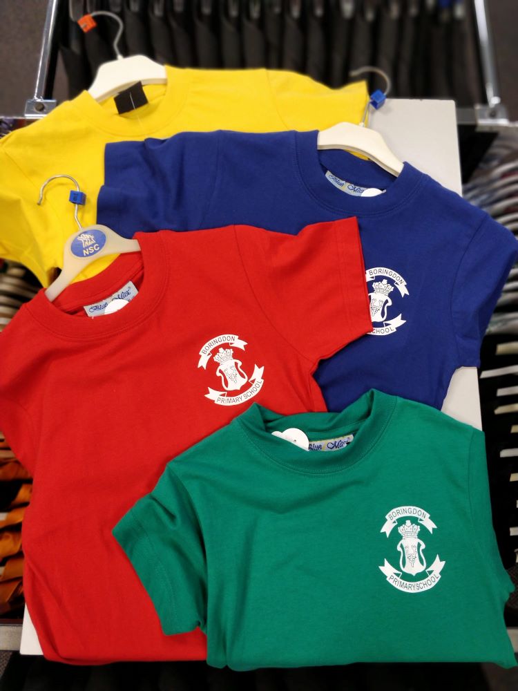 Kid’s cotton T-shirt. Screen-printed for Boringdon Primary in school house colours: