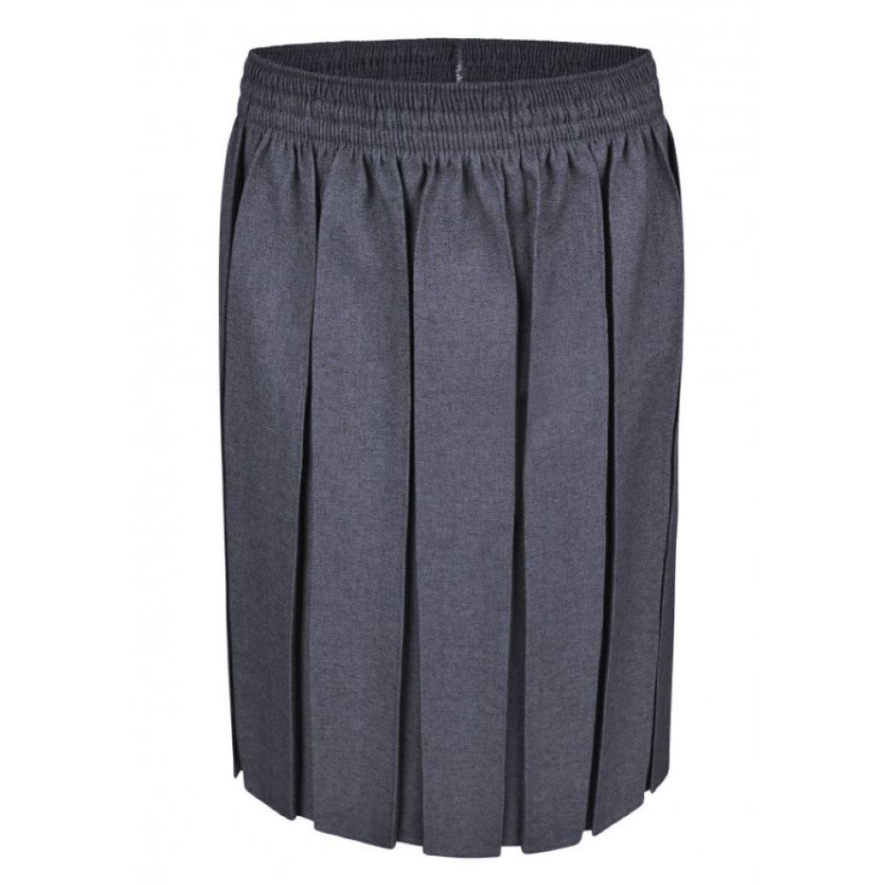 Grey skirt for MAP with fully elasticated waist; box pleats all round; easy pull on – no zip or button.