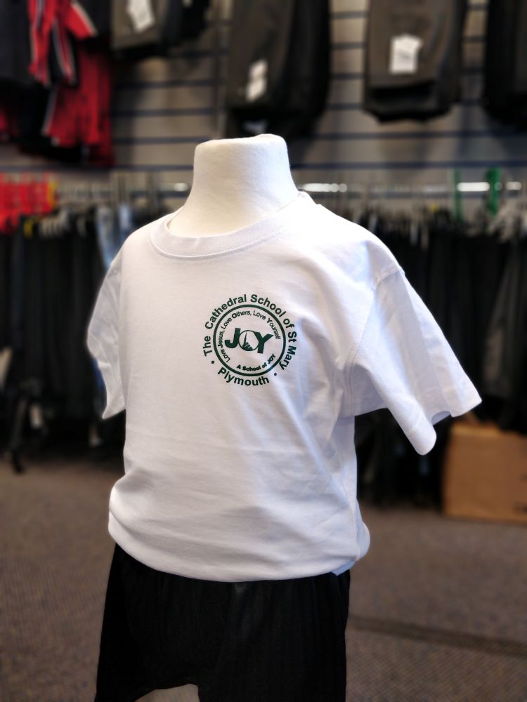 Ribbed neck; taped back neck seam; twin needle finish to neck & hems.Kid’s cotton T-shirt. Screen-printed for Cathedral School of St Mary.