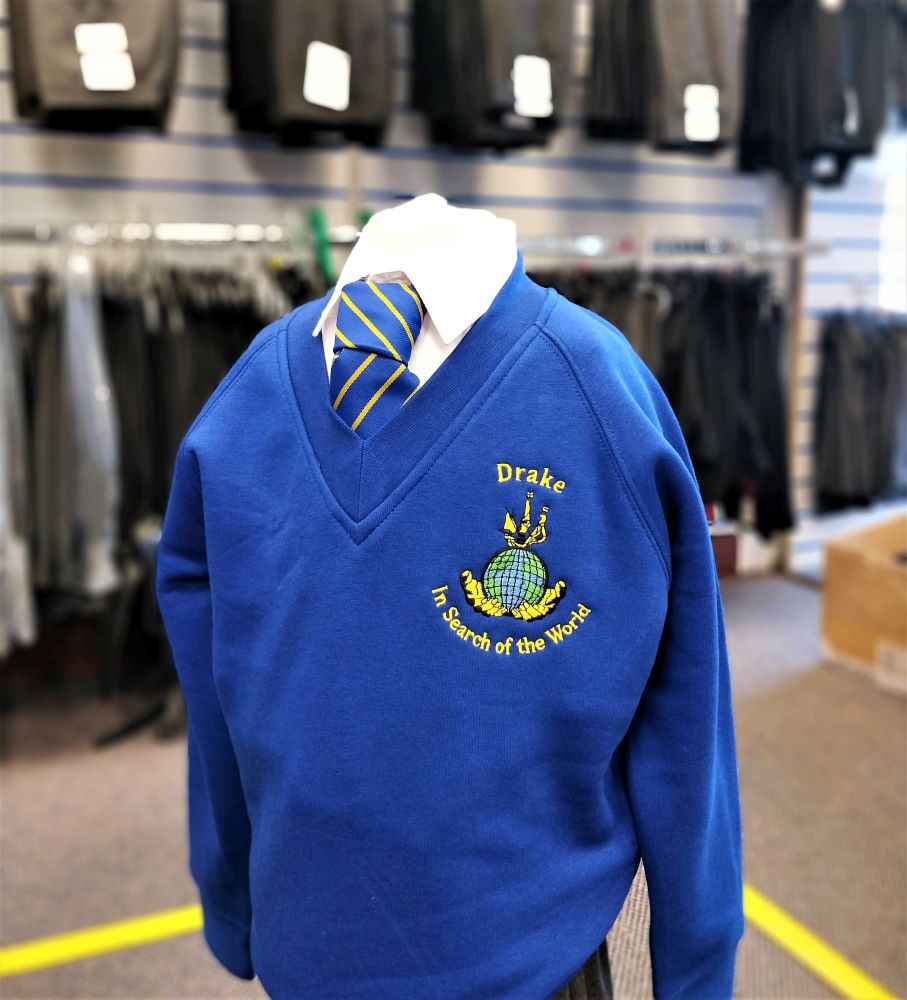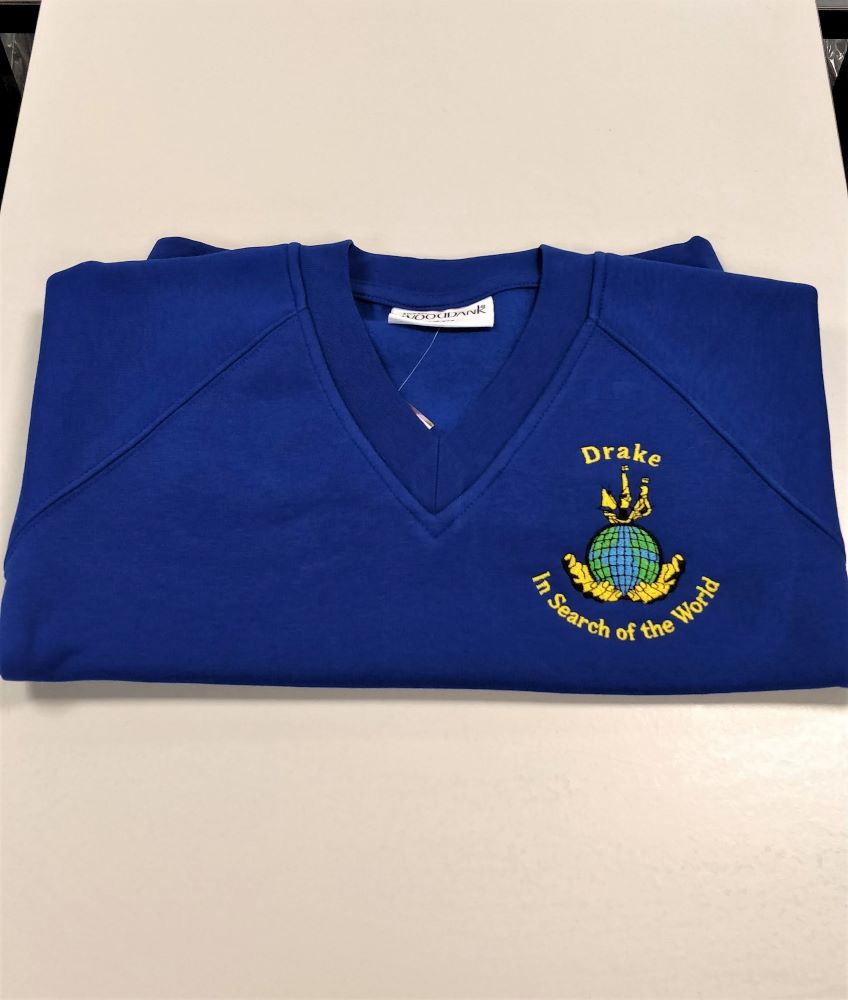 V-neck sweatshirt. Embroidered for Drake Primary School.