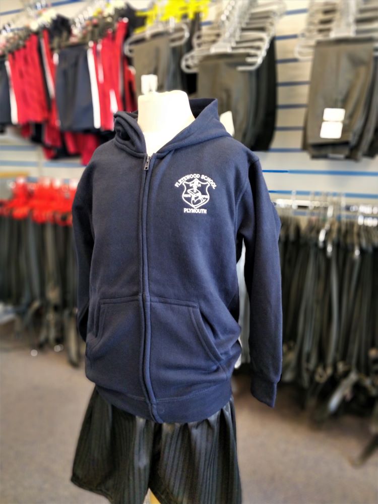 Navy zipped PE hoodie. Embroidered for Fletewood School.