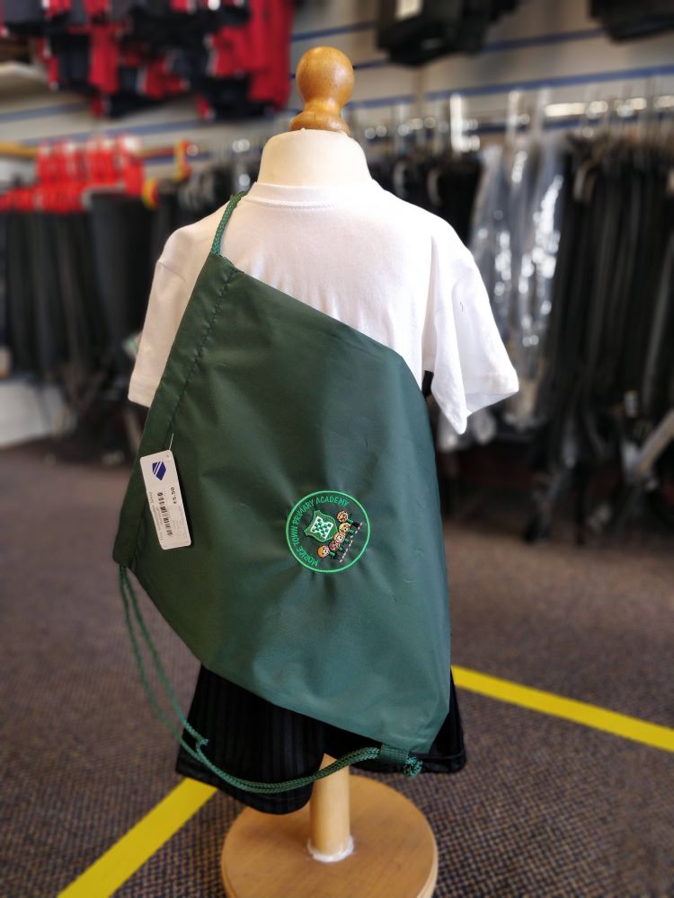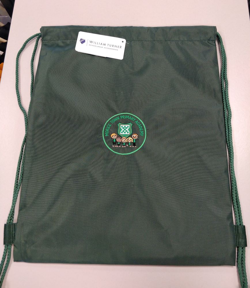 Drawstring PE bag. Ideal for swimwear and muddy kits. Embroidered for Morice Town Primary Academy.