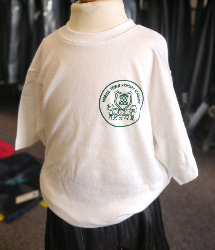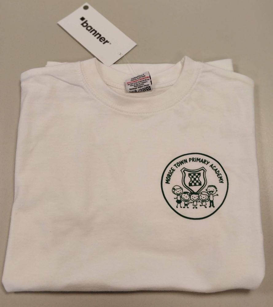 Ribbed neck; taped back neck seam; twin needle finish to neck & hems.Kid’s cotton T-shirt. Screen-printed for Morice Town Primary Academy.