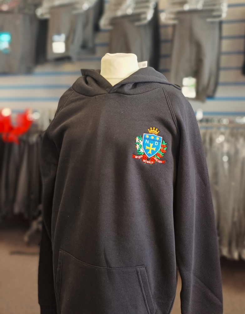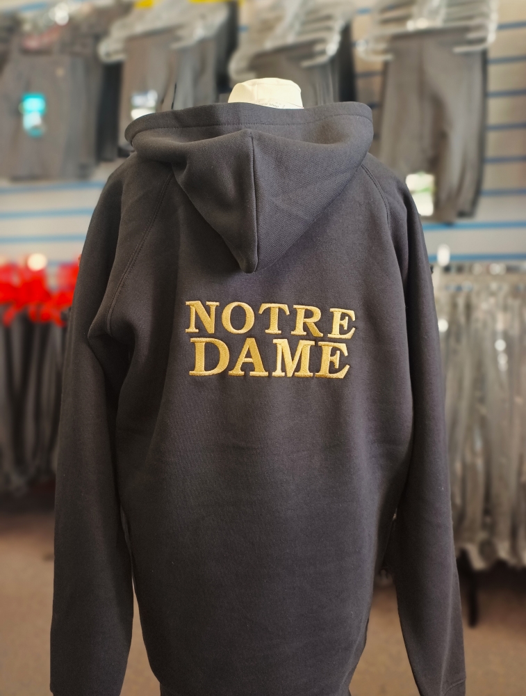 50% Cotton / 50% Polyester generous cut hoodie embroidered front and back for Notre Dame School.