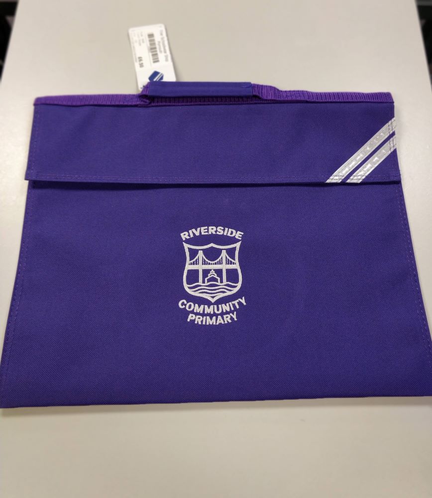 School book bag. Embroidered for Riverside Primary School. Comes with name card and reflective strips. Size: 12″ X 14.5″ Material: 450D polyester. Sponge clean only.