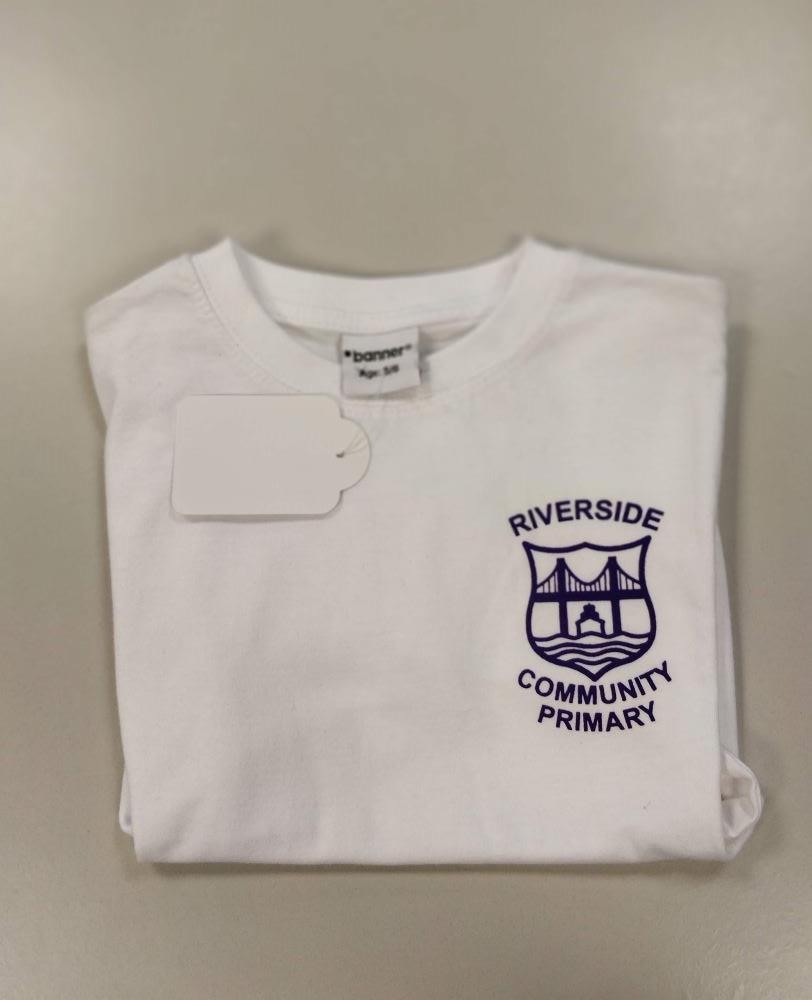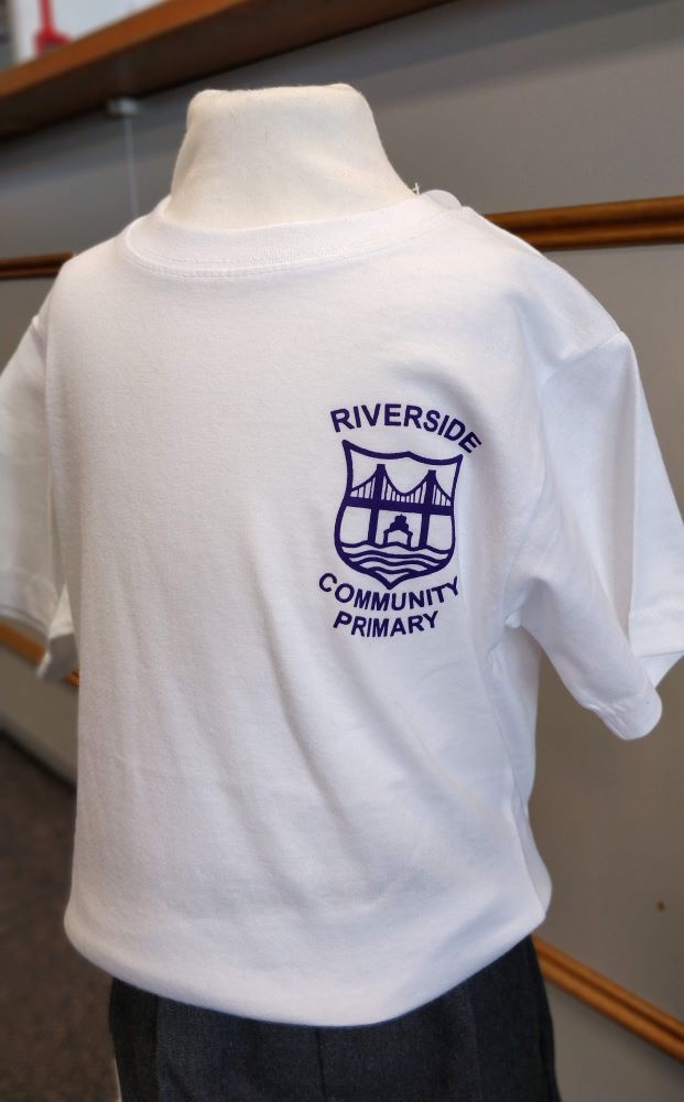 Ribbed neck; taped back neck seam; twin needle finish to neck & hems.Kid’s cotton T-shirt. Screen-printed for Riverside Primary School.