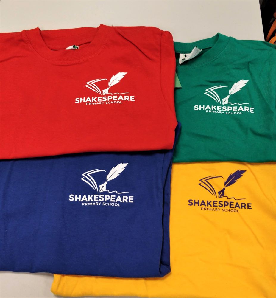 Kid's cotton T-shirt. Screen-printed for Shakespeare Primary School. Available in house colours (red, green, blue & yellow).