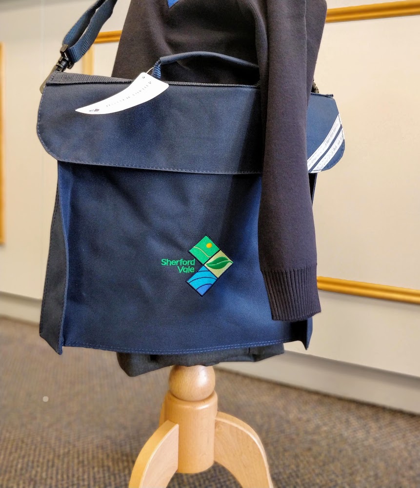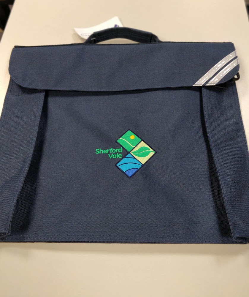 All-rounder junior school bag with removable shoulder strap. Embroidered for Sherford Vale Primary School.
