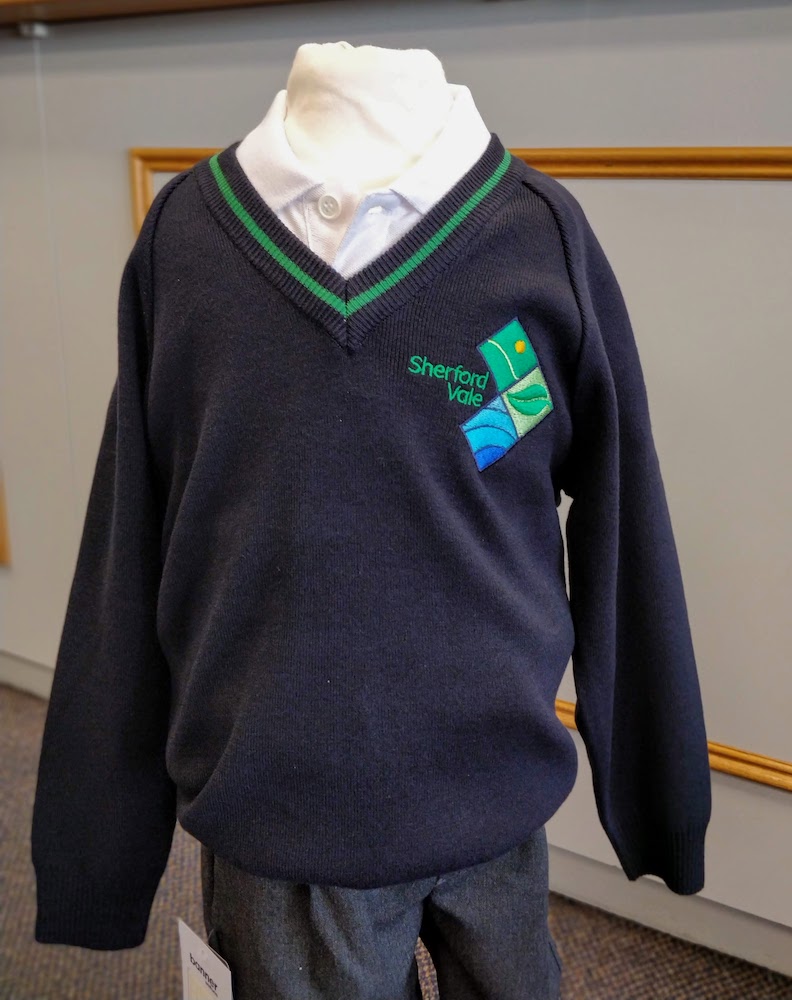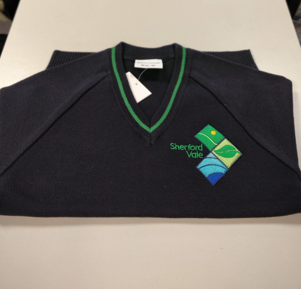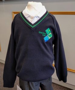 50% combed cotton/50% high bulk acrylic composition V-neck jumper giving both comfort and fantastic durability. Striped and embrdoidered for Sherford Vale Primary School.