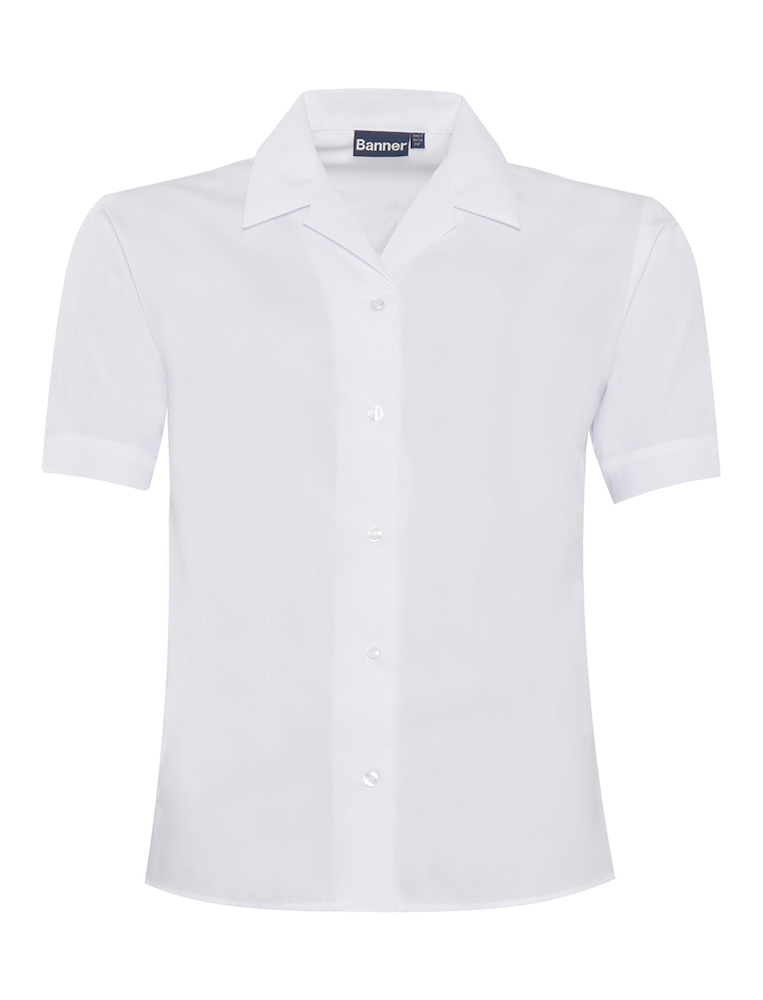 Stylish white revere collar non-iron blouse with short sleeves and side vents.