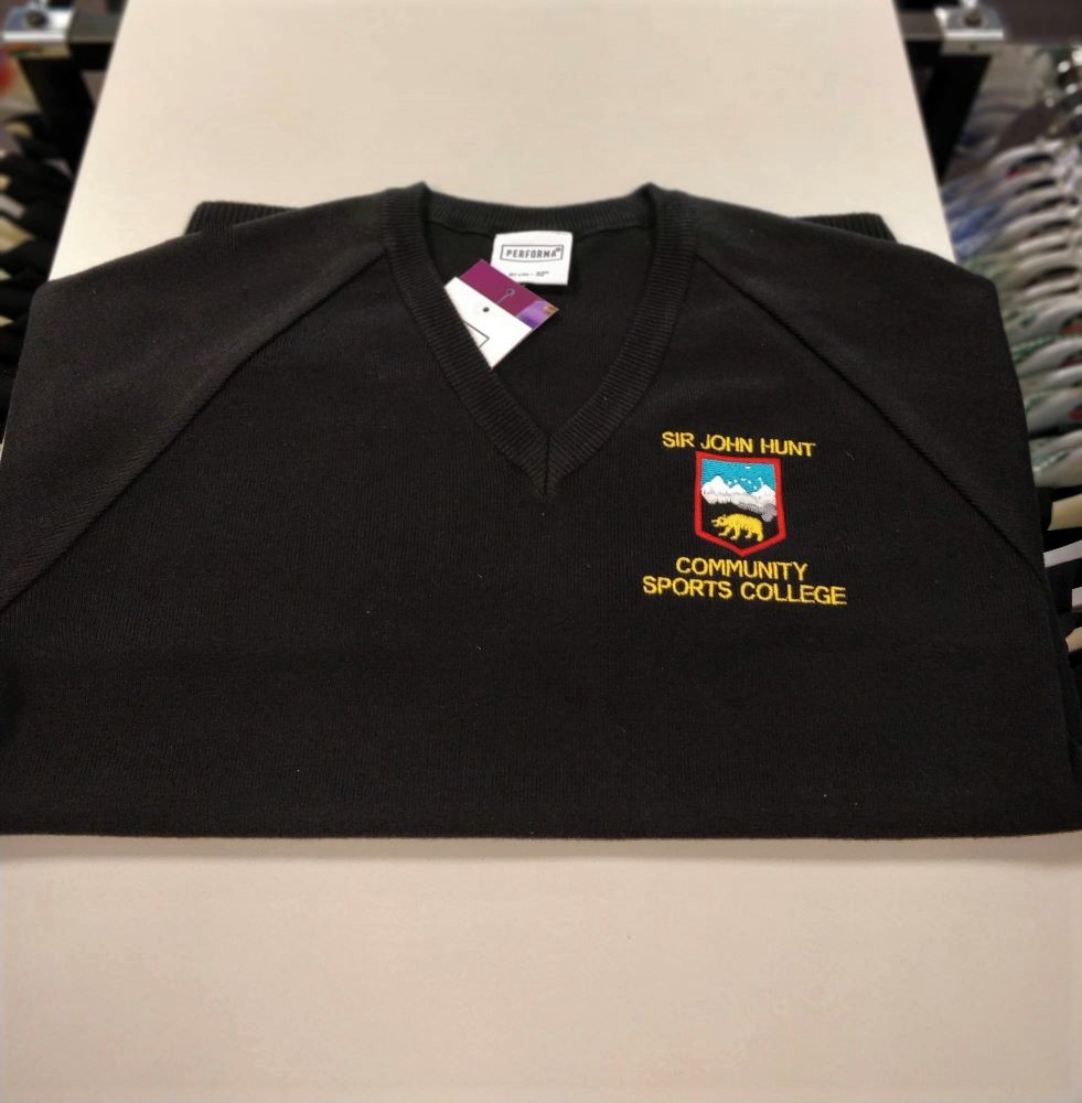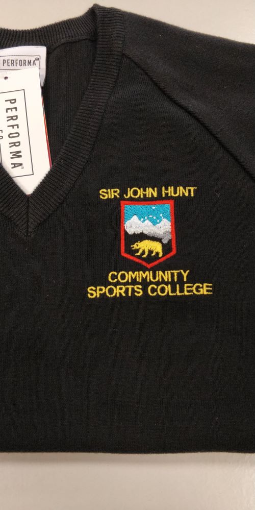 50% combed cotton/50% high bulk acrylic composition V-neck jumper giving both comfort and fantastic durability. Embroidered for Sir John Hunt Community College.
