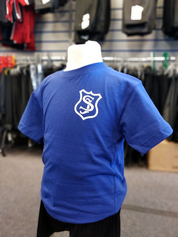 Ribbed neck; taped back neck seam; twin needle finish to neck & hems.Kid’s cotton T-shirt. Screen-printed in royal blue for St Josephs Catholic Primary School.