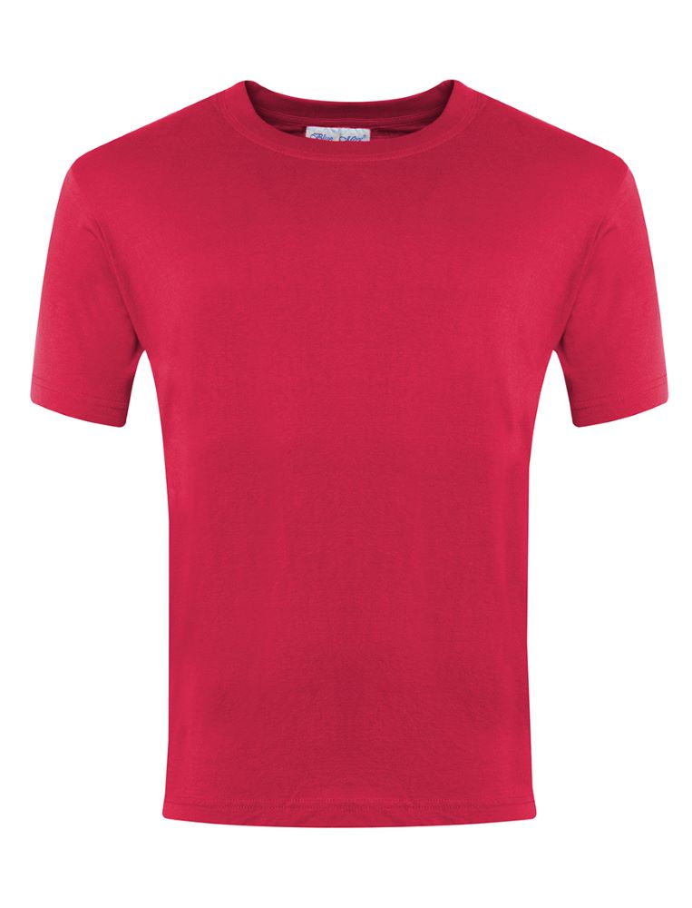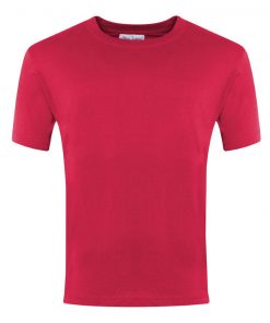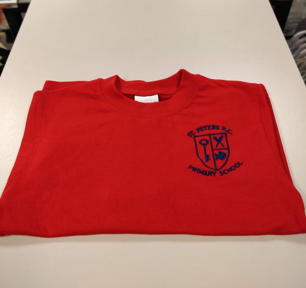 Ribbed neck; taped back neck seam; twin needle finish to neck & hems.Kid’s cotton T-shirt. Embroidered for St. Peter’s RC Primary School.