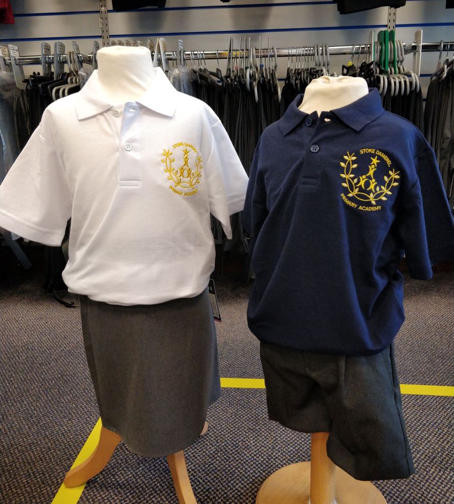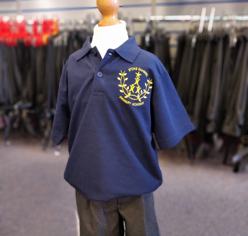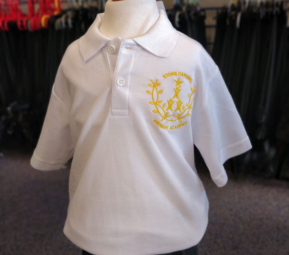 Three-button polo shirt. Embroidered for Stoke Damerel Primary Academy in white (standard) and navy (summer term) options.
