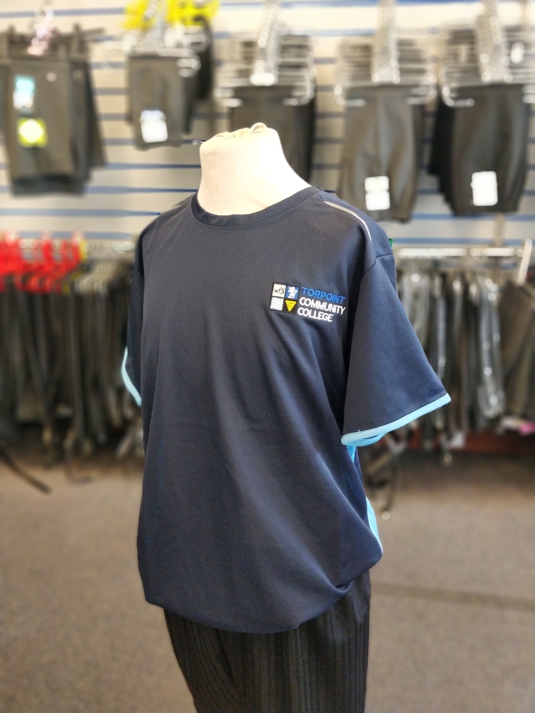 Navy/sky short sleeve training tee embroidered for Torpoint Community College.