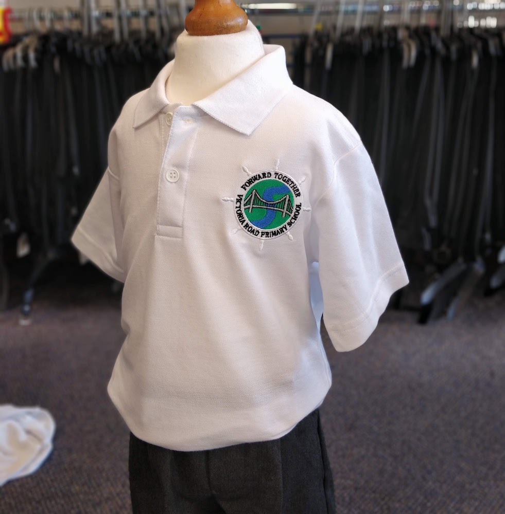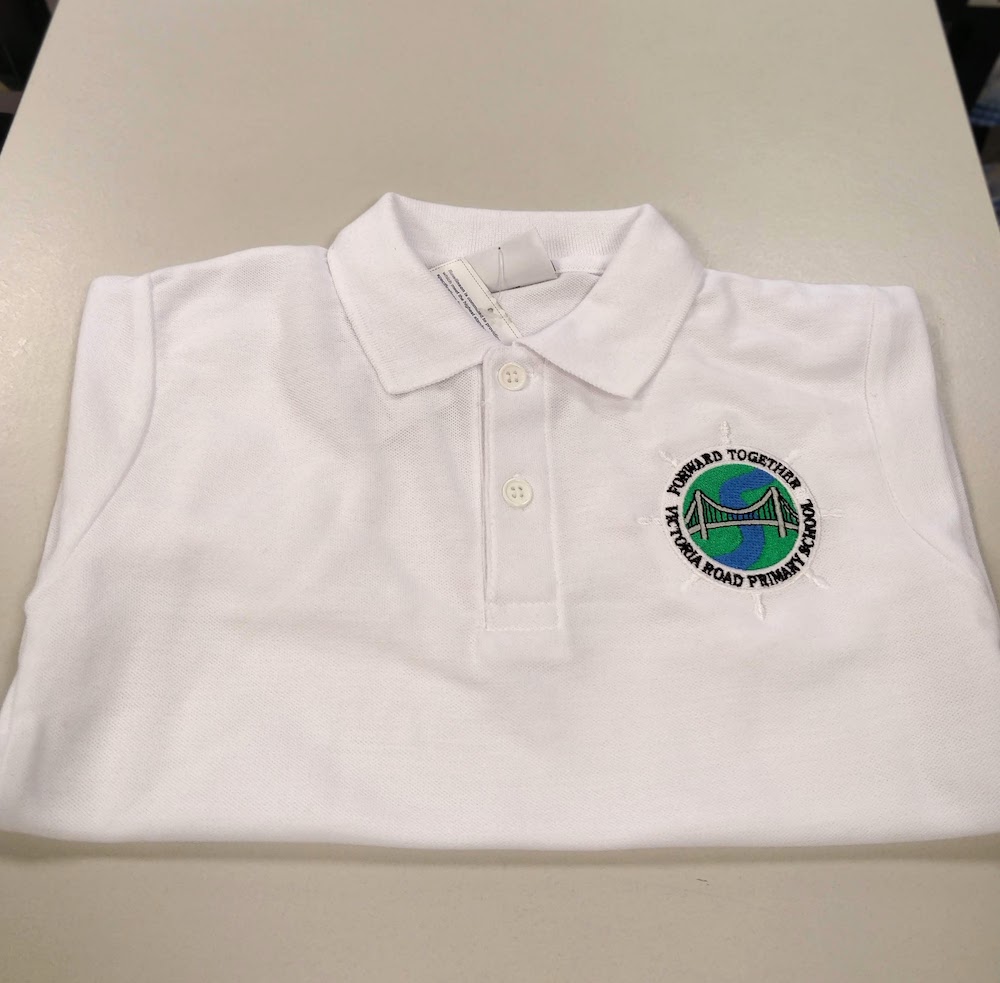 Three-button polo shirt. Embroidered for Victoria Road Primary School.