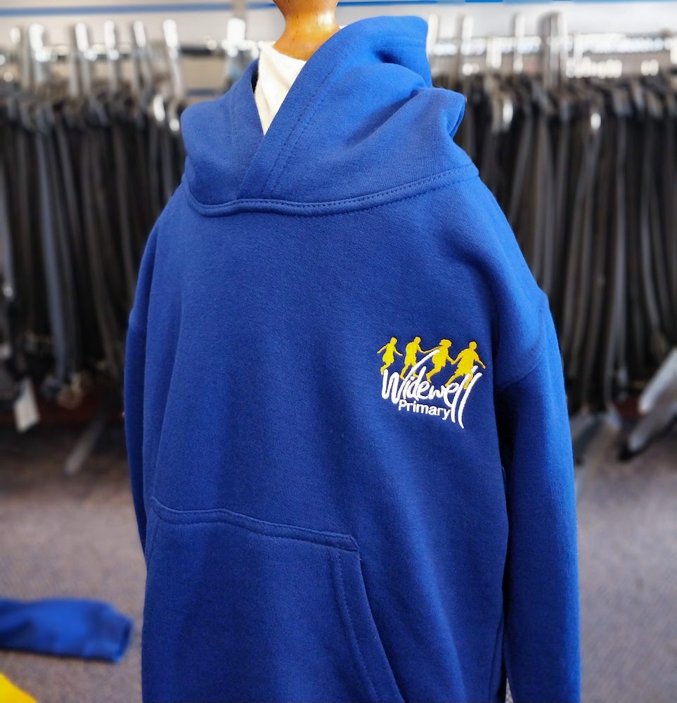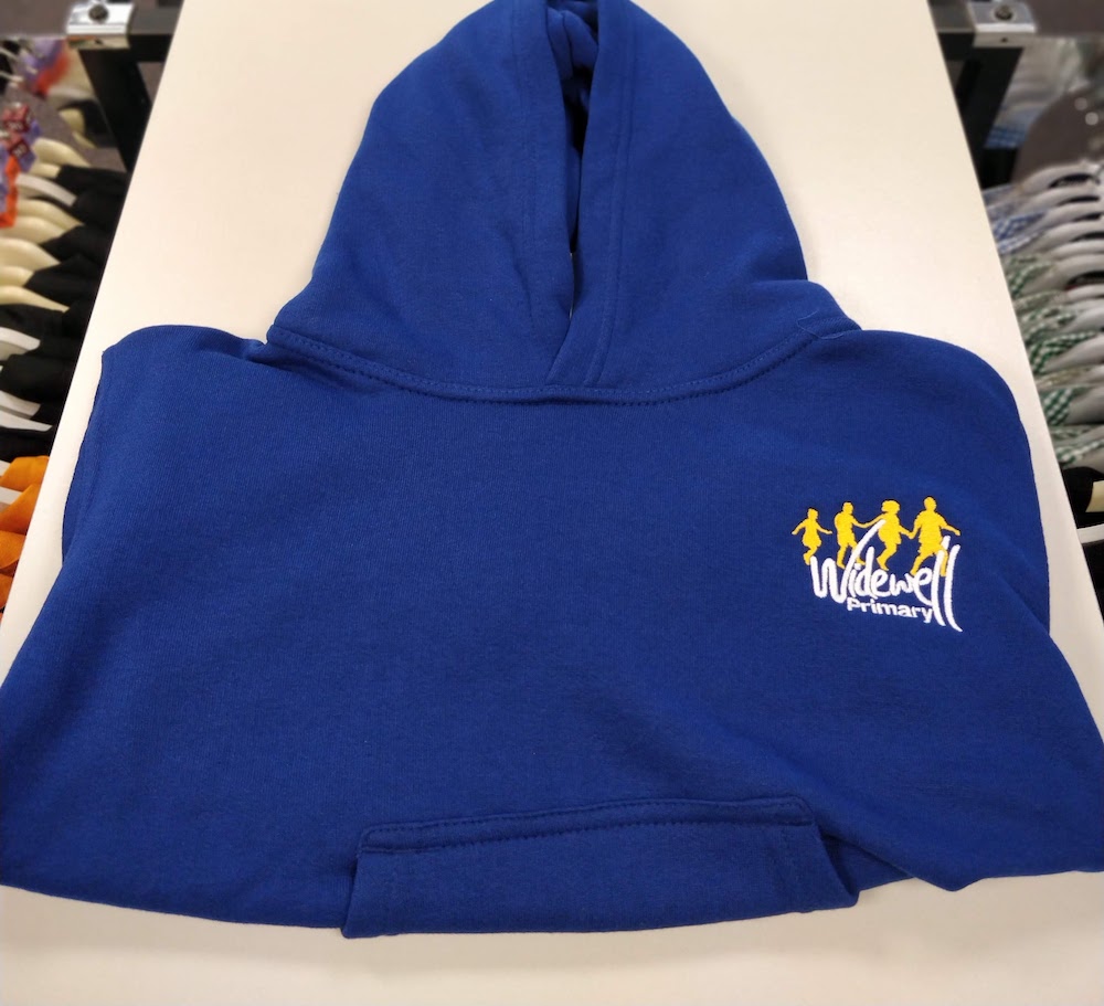 50% Cotton / 50% Polyester generous cut hoodie embroidered for Widewell Primary Academy.