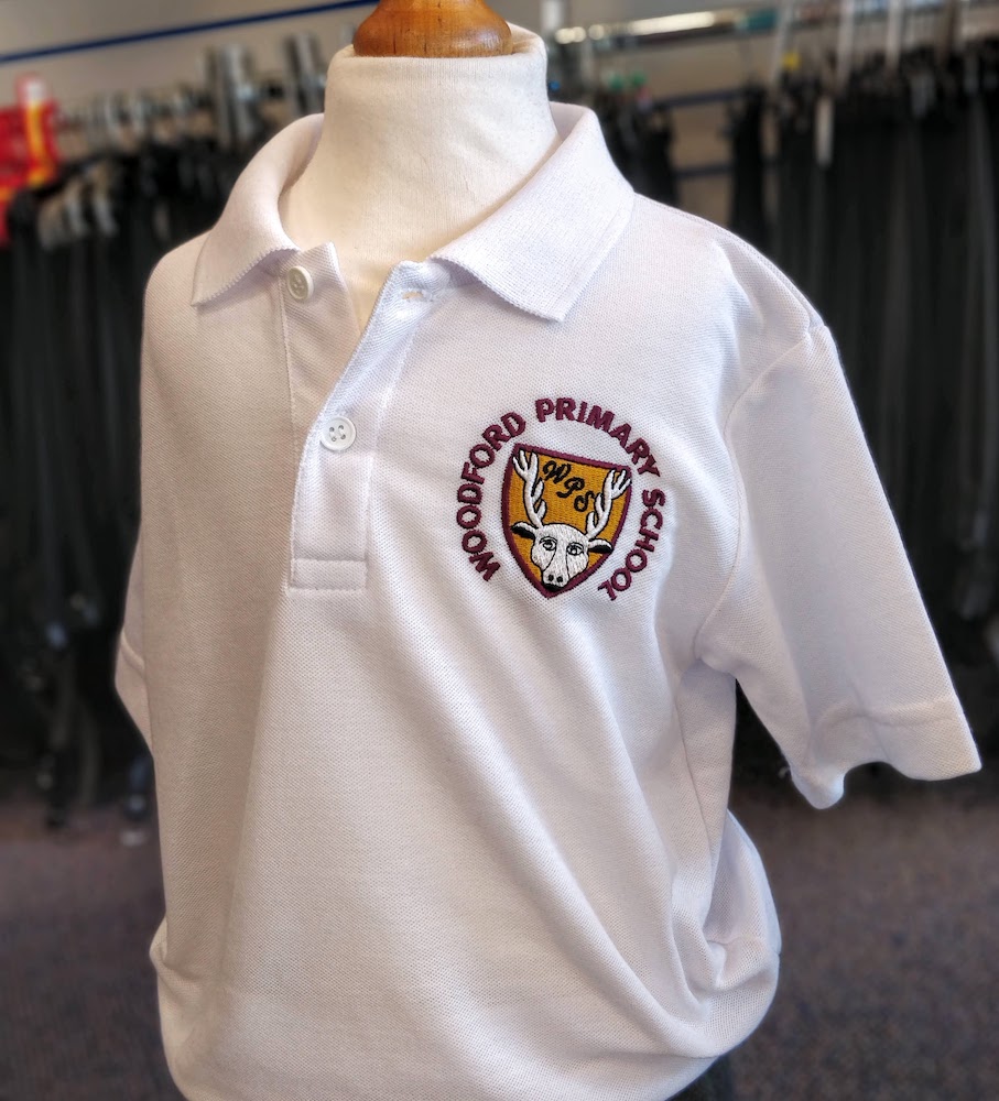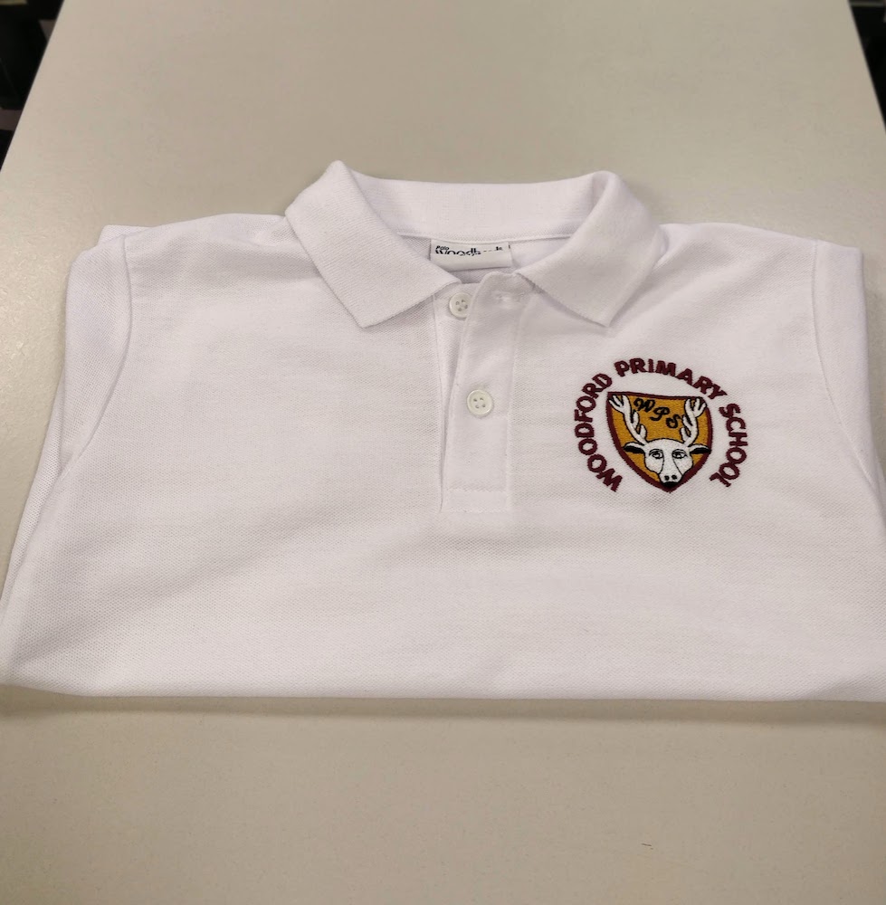 Three-button polo shirt. Embroidered for Woodford Primary School.