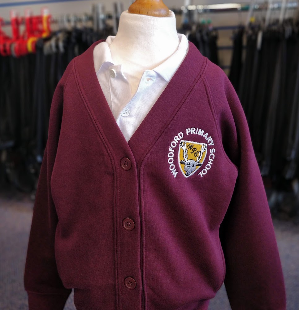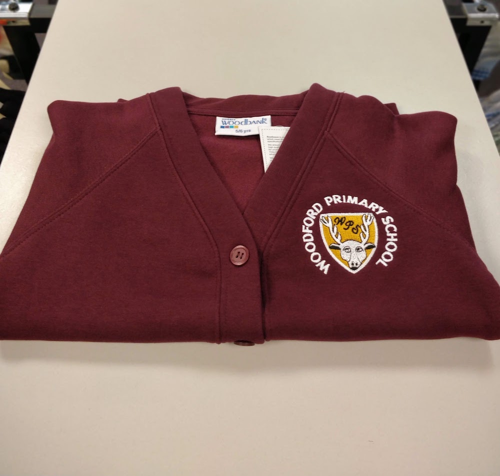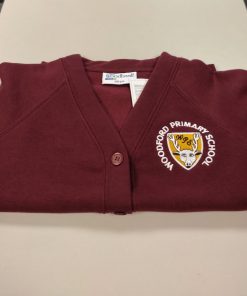 Five button sweatshirt cardigan with sewn in pockets. Embroidered for Woodford Primary School.